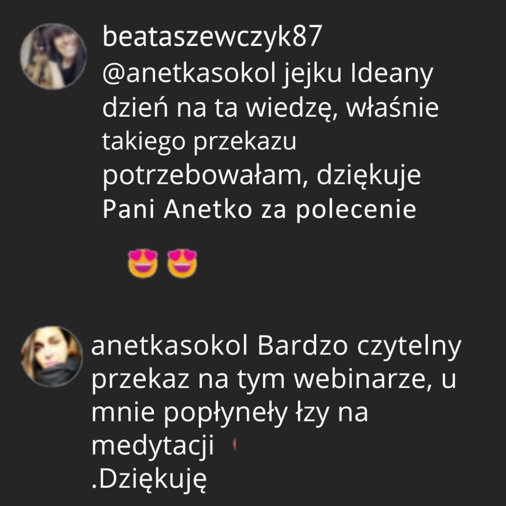 Dziękuję Ci za ten proces w kursie, wiem, że to dopiero początek mojej transformacji. Najbardziej pomogłaś mi w staniu się sobą i poradzić sobie kiedy innym nie podoba się, że zaczynam mówić NIE, stawiam siebie na pierwszym miejscu. Moje życie było pasmem cierpienia, dzięki Tobie spojrzałam, że tkwiłam w roli ofiary i przerzucać odpowiedzialność na innych. Łatwe to dla mnie nie było, ale odważyłam się powiedzieć o moim wstydzie. Będę wracać do kursu, aby przypominać sobie co jest dla mnie ważne, że nie muszę być perfekcyjna, mogę prosić o pomoc i współczuć sobie. Medytacje są fantastyczne, chociaż miałam opór. Medytacja współczucia jest ze mną już 26 dzień:) To mój rekord w wytrwałości! Uważam, że jesteś jedną z najlepszych trenerek z jakimi miałam okazję pracować lub ich słuchać online lub na żywo. A na pewno było już ich kilkudziesięciu, jak nie więcej.