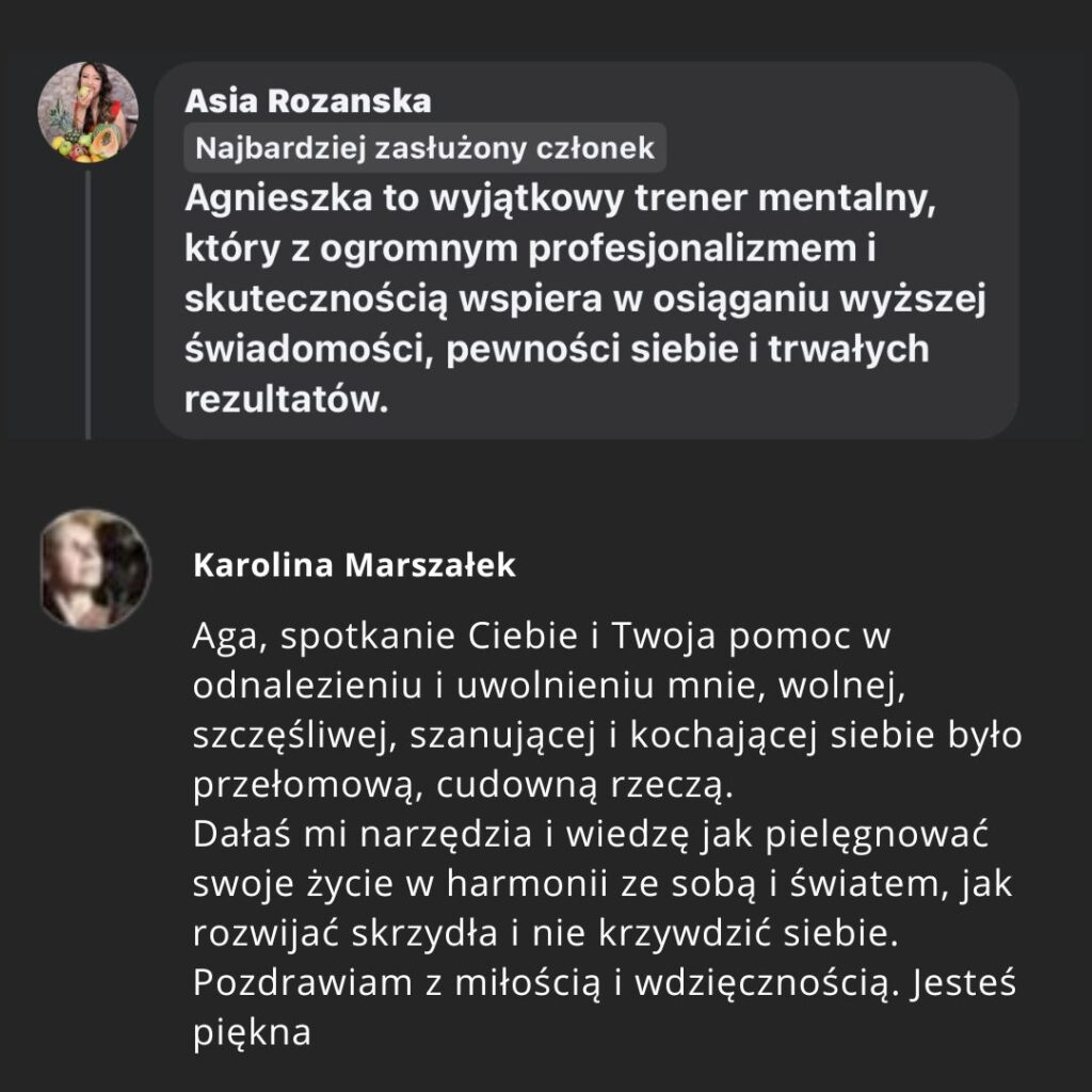 Jestem niezmiernie wdzięczna Agnieszce za poświęcony mi czas i Jej pomoc w odnajdywaniu szczęśliwej mnie, poczucia własnej wartości i siły. Sesje z Agą dały mi nowe spojrzenie na siebie samą, z uwagą, troską i miłością. Po wielu latach tłamszenia siebie, obaw, hamowania, ograniczania na rzecz innych, w końcu zaczęłam widzieć, słuchać i dbać o siebie.
