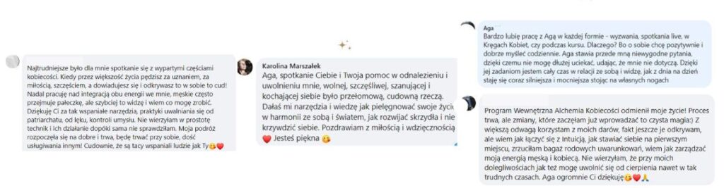 Aga niespodziewałam się, że ten program tak dużo zmieni w moim myśleniu, funkcjonowaniu. Długo już się rozwijam, jestem po kilku latach terapii, ale nikt nie powiedział mi tylu ważnych kwestii związanych z kobiecością i męskością, zaczęły się łączyć kropki, pojawiało się mnóstwo momentów AHA. Wiem, że przede mną sporo do uzdrowienia, ale wiem gdzie szukać, gdzie udać się po wsparcie, mam więcej zrozumienia dla siebie, co mam robić, aby wspierać uzdrawianie odrzuconej kobiecości we mnie, aby połączyć się z moim ciałem, słuchać intuicji, obserwować sny i siebie. Praktyki, które przedstawiłaś w programie są bardzo wspierające, dotarłam do wglądów z Wewnętrznym Dzieckiem, które bardzo uwolniły moje głęboko skrywające poczucie winy. To fascynujący proces ogromnie polecam skorzystanie z tego programu. Wiedza, praktyki jak dla mnie na wyższym poziomie świadomości.
